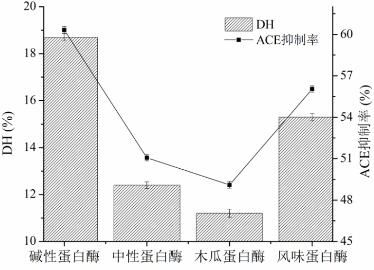 將上述的四種蛋白酶在各自的**適酶解條件下對核桃蛋白進(jìn)行酶解,以ACE抑制率和水解度為指標(biāo),選出制備核桃降壓肽的**適用酶,結(jié)果見圖2: