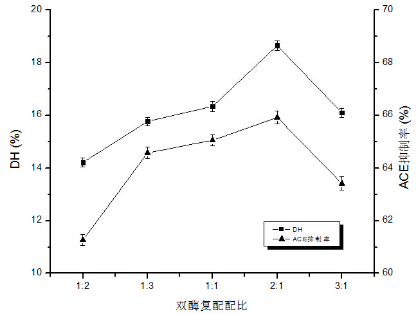 圖3-2.雙酶復(fù)配配比對酶解液ACE抑制率和水解度影響