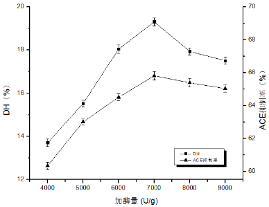 由圖3-3可知,隨著加酶量的增大,酶解液的ACE抑制率和水解度增大,在加酶量為7000U/g時ACE抑制率達(dá)到**大值,原因可能是隨著酶濃度的增加,有利于酶與底物的結(jié)合,對酶解有促進(jìn)的作用。隨著加酶量的繼續(xù)增大,酶解液的ACE抑制率和水解度略有降低,原因可能是一部分具有ACE抑制活性的多肽被進(jìn)一步水解成不具有降壓活性的小肽。故選擇7000U/g為**適加酶量。