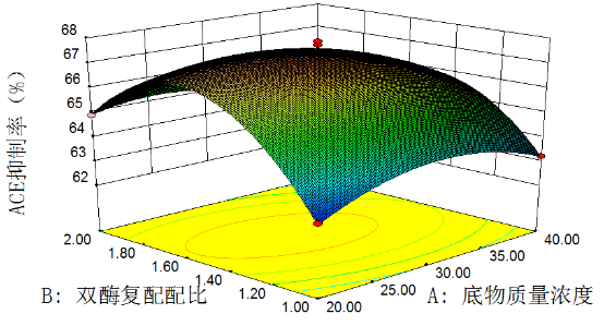 利用Design-Expert 8.0軟件進(jìn)行工藝參數(shù)的優(yōu)化組合,得到堿性蛋白酶-風(fēng)味蛋白酶分步酶解核桃蛋白制備ACE抑制肽的**佳工藝為:底物質(zhì)量濃度28.80g/L、加酶量6000U/g、雙酶復(fù)配配比3:2,ACE抑制率可達(dá)到67.7217%。根據(jù)實驗室條件調(diào)整酶解工藝為底物質(zhì)量濃度29g/L、加酶量6000U/g、雙酶復(fù)配配比3:2,得到的實際抑制率67.05%。