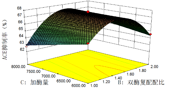 由表3-3的方差分析可知,模型的F值為53.95,P<0.0001,說明該模型是極顯著的,一次項A,B,C均影響極顯著,說明雙酶復(fù)配配比、底物質(zhì)量濃度和加酶量對ACE抑制率和水解度具有顯著性影響,交互項AD,BD,CD的偏回歸系數(shù)達(dá)到極顯著水平。失擬項在0.05水平上不顯著(P=0.6059),說明殘差均由隨機誤差引起。響應(yīng)面曲線越陡則影響越顯著,從下圖可以看出堿性蛋白酶與風(fēng)味蛋白酶添加量比例與底物濃度交互作用曲線相對較陡,說明二者交互作用相對明顯,對水解效果的影響相對較強,酶解溫度曲線變化則比較平緩,對水解效果影響相對較弱。