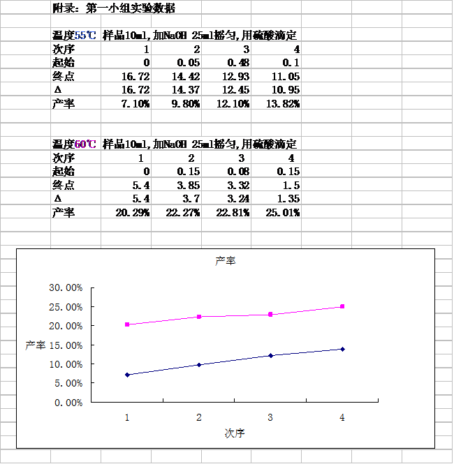 2、 第二組反應溫度比**組高5度,但是產率卻大大高于**組,我們分析出現這種現象的原因可能是溫度升高在較短的反應時間內對反應速率影響較大。